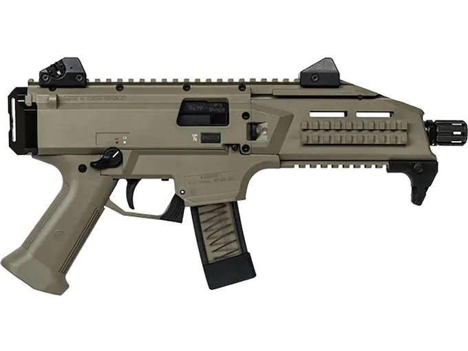 CZ-USA Scorpion EVO 3CZ-USA Scorpion EVO 3 S1 Semi-Automatic Pistol. Imported as a pistol, it is a blowback-operated semi-auto in 9mm with a short 7¾” barrel. Equipped with CZ’s newly designed low-profile sights, its rear sight has four different aperture sizes for everything from close quarters to way out there. The sights ride on an 11” Picatinny rail perfect for mounting optics. Starting in 2016, Scorpion Pistols feature 1/2″×28 threads hidden underneath the factory flash-hider, meaning users can fit either 1/2″×28 or 18×1 accessories to the muzzle. Also added is a QD sling swivel pocket integrated into the rear sling attachment point. Simple and reliable, the Scorpion not only has ambidextrous controls, its non-reciprocating charging handle is swappable and reach to the trigger is adjustable.