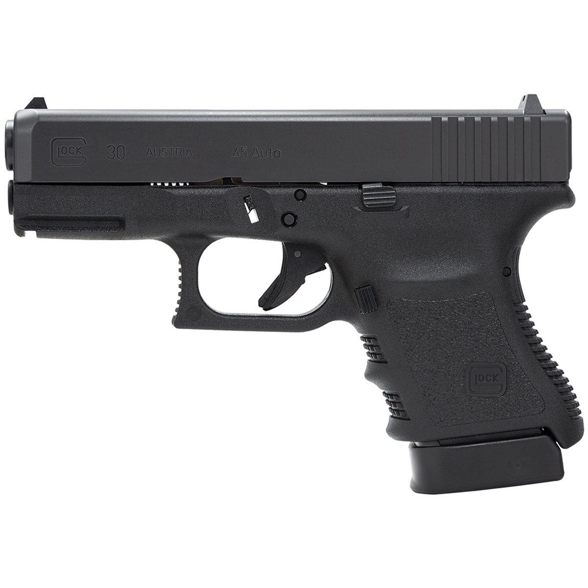 GLOCK 30 SF Semi-Auto Pistol The GLOCK® 30 SF Semi-Auto Pistol is a subcompact semi-auto pistol designed specifically for concealed carry use, shooting the .45 ACP pistol cartridge, a round with proven knockdown power. The GLOCK 30 SF (Slim Frame) has a frame made out of the same high-strength polymer as other full-sized GLOCK semi-automatic pistols, though the circumference has been reduced in the backstrap area, reducing the distance between the trigger and backstrap. The G30 SF handles better for shooters with normal to smaller-sized hands, while still using a double-stack magazine of 45 ACP ammo. The frame has checkering on the front and back straps, providing a non-slip surface, and finger grooves on the front strap and a finger rest on the front of the trigger guard aid in fire control. The Safe-Action trigger system makes shooting in high-stressed situations infallible. The milled steel slide and the barrel are treated with matte black Tenifer finish for extreme resistance to wear and corrosion. The Tenifer treated steel and polymer frame make the pistol impervious to corrosion caused by perspiration and humidity when carried close to the body. The slide cycles on 4 hardened steel guide rails within the frame. A white-dot front sight and a white-bracket rear sight provide rapid acquisition in dim lighting situations. All GLOCK pistols fieldstrip easily without the use of tools. The GLOCK 30 SF Semi-Auto Pistol is a reliable, easy-to-maintain firearm that’s perfect for everyday carry, or as a backup for security personnel. The G30 SF comes with 2 double-stack 10-round magazines, and also functions with G30 and G21 mags.