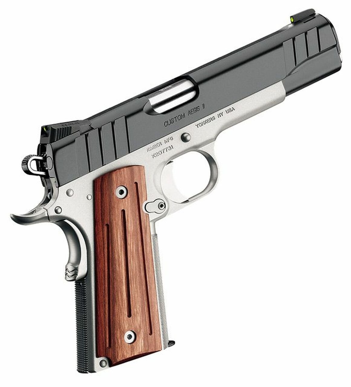 Kimber Custom Aegis II 9mm 5 Kimber Custom Aegis II 9mm 5 This new Kimber Aegis II in 9mm is both a nice looker and a great shooter. The more I shoot it, the more I like it. I find it to be even better than the previously produced full-sized, all-steel 9mm, the Stainless Target II, which is a good gun in its own right. Last year, Kimber introduced the Aegis, a subcompact with a 3-inch barrel and shortened alloy frame. I had the opportunity to review it and the Stainless Target II, finding them both to deliver outstanding performance. This new addition to what has become the Aegis family brings together the best features of all of them by combining the alloy frame and steel slide with a full-sized 5-inch barrel in the same 9mm caliber. The bonus is how this Custom Shop creation has also been crafted to work well as a personal defense handgun in addition to being perfectly qualified for action shooting sports. Lightweight, compact, and absolutely reliable, custom Aegis® models are built in the Kimber Custom Shop for shooters with small hands. Thin grips, altered controls, and rounded edges make them easy to shoot. A great single-stage 1911 trigger that breaks cleanly at 4-5 pounds makes them easy to shoot accurately. Standard features include night sights, 30-lines-per-inch front strap checkering, and a premium two-tone Kimber custom II finish that is both self-lubricating and extremely resistant to moisture.